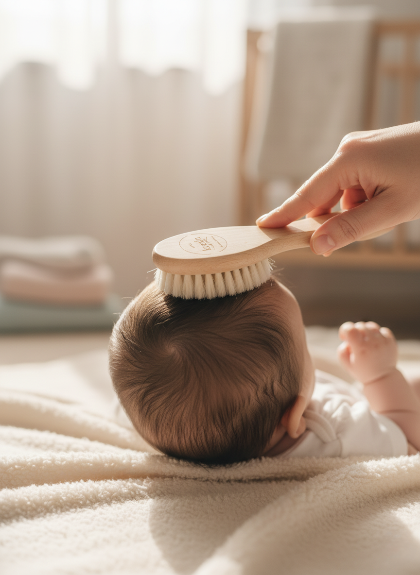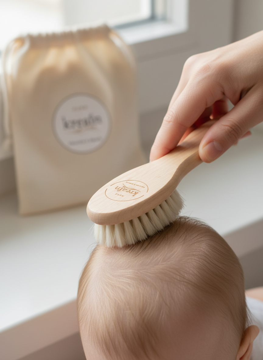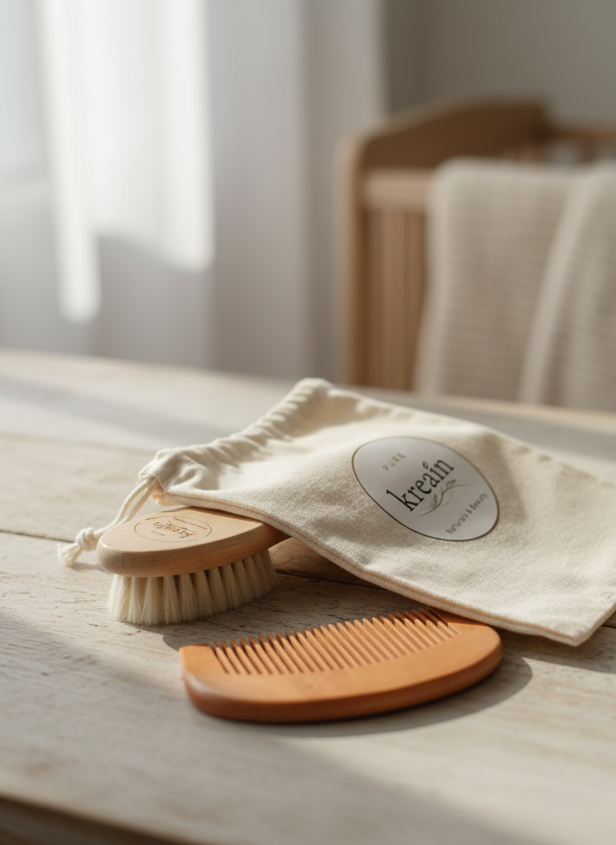 Designed with love for your baby’s delicate scalp. This 2-piece set includes a soft goat-hair brush and a smooth wooden comb, perfect for gently brushing newborn hair and massaging the scalp. Naturally anti-static, gentle, and safe for daily use.
